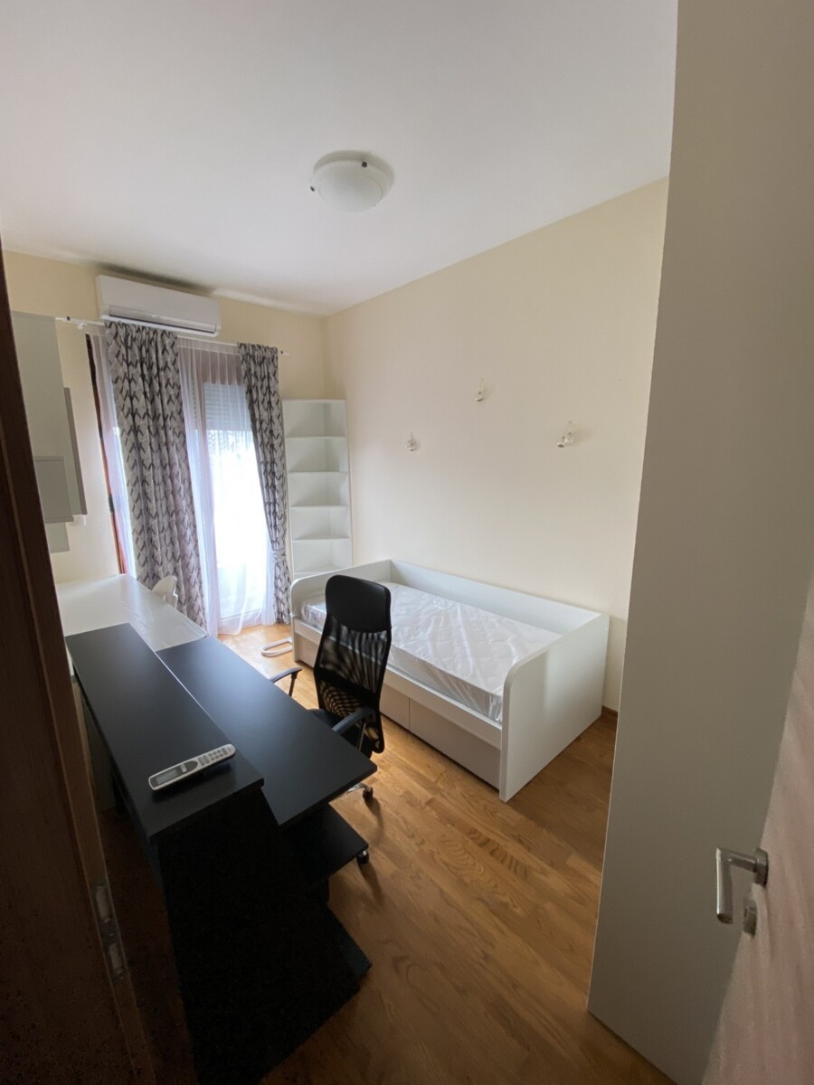 A three-bedroom apartment with an area of 90 m² is for rent opposite the Economic School, located on the first floor. The apartment is nicely furnished and ready to move in, and the rental price includes two garage spaces. The location is very practical and well-connected. The monthly rent is €1,000.