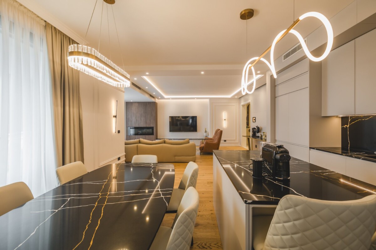 It is equipped with modern materials, expensive furniture, as well as top-quality built-in technology in the kitchen and laundry room, brand BOSCH.