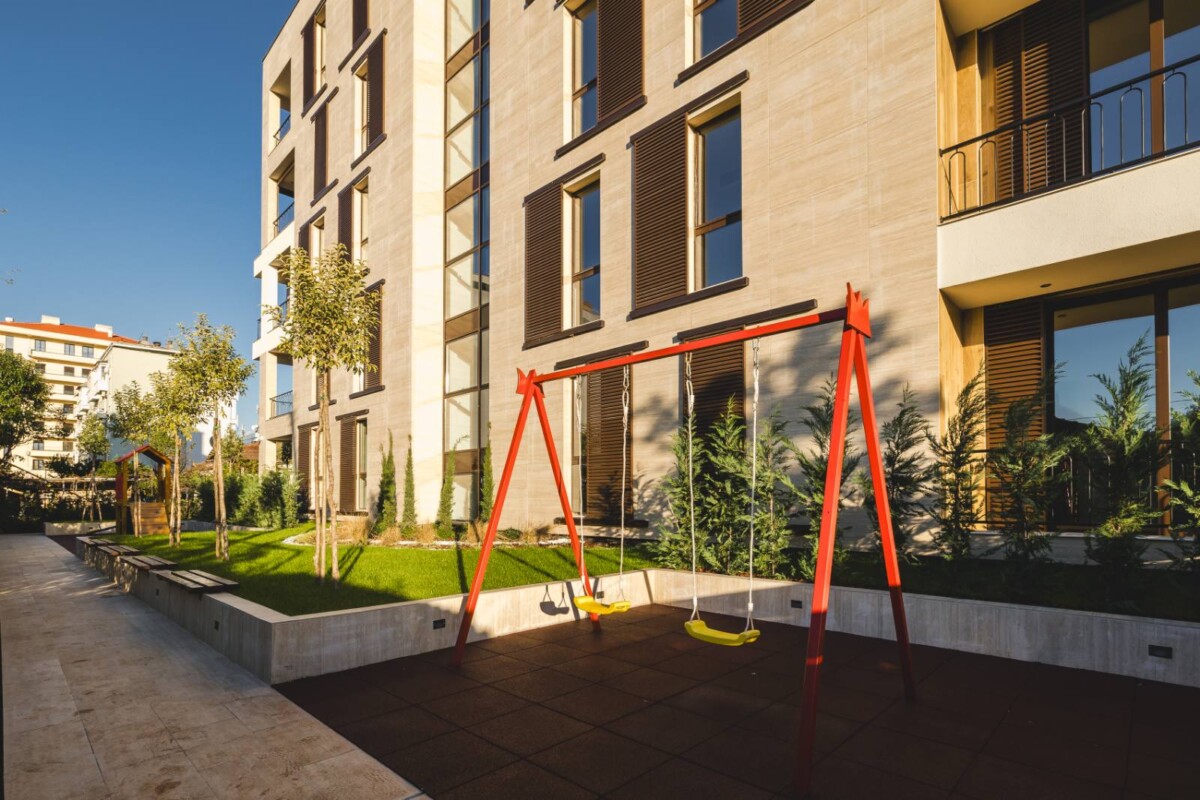 In the courtyard part of the building, there is a playground for children, which you can monitor via the TV screen in the apartment itself via a camera that monitors the playground.