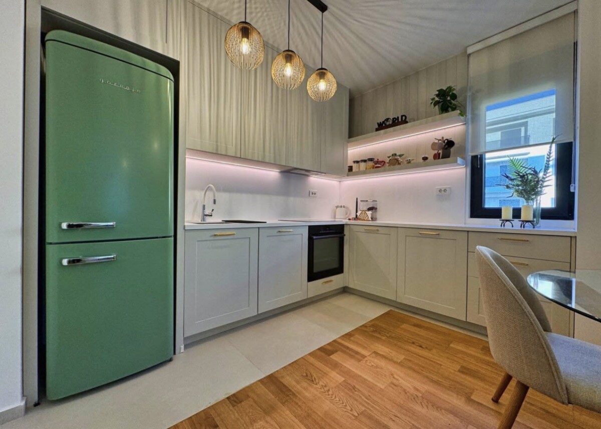 Kuhinja je izrađena po mjeri od strane renomirane kompanije u Crnoj Gori, vrhunskog standarda izrade i materijala.