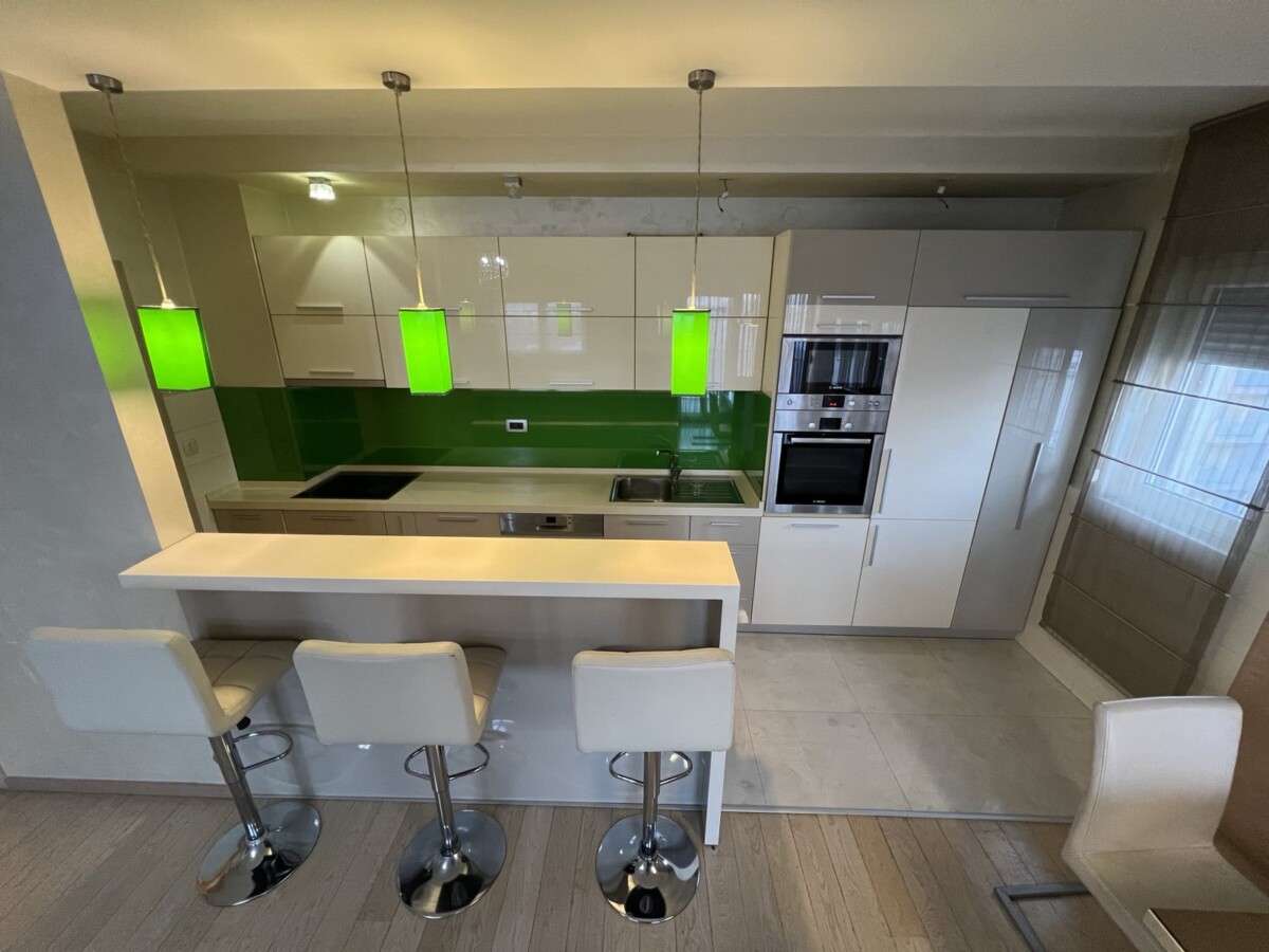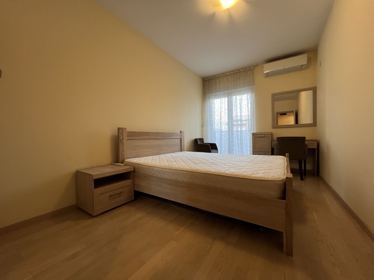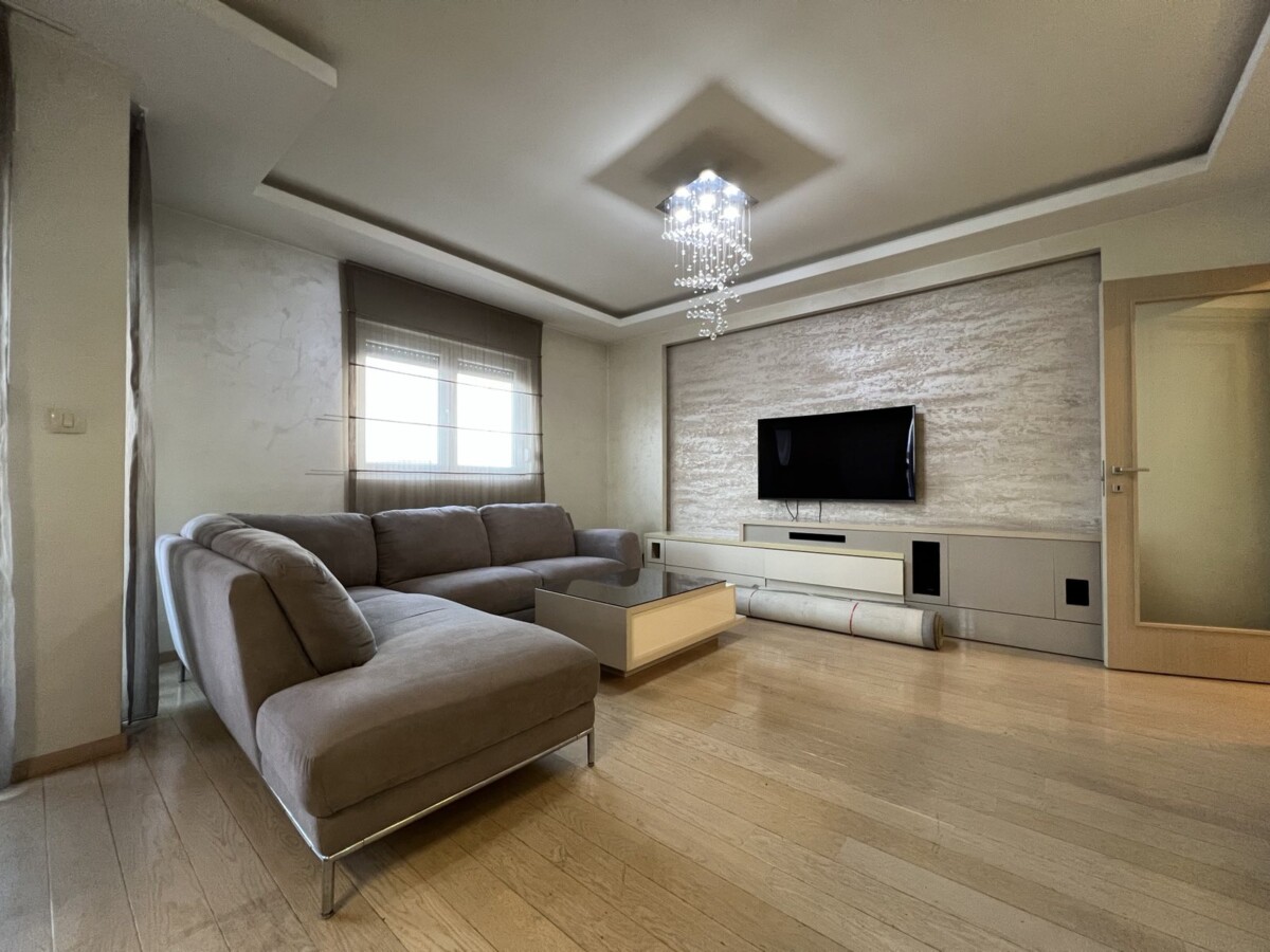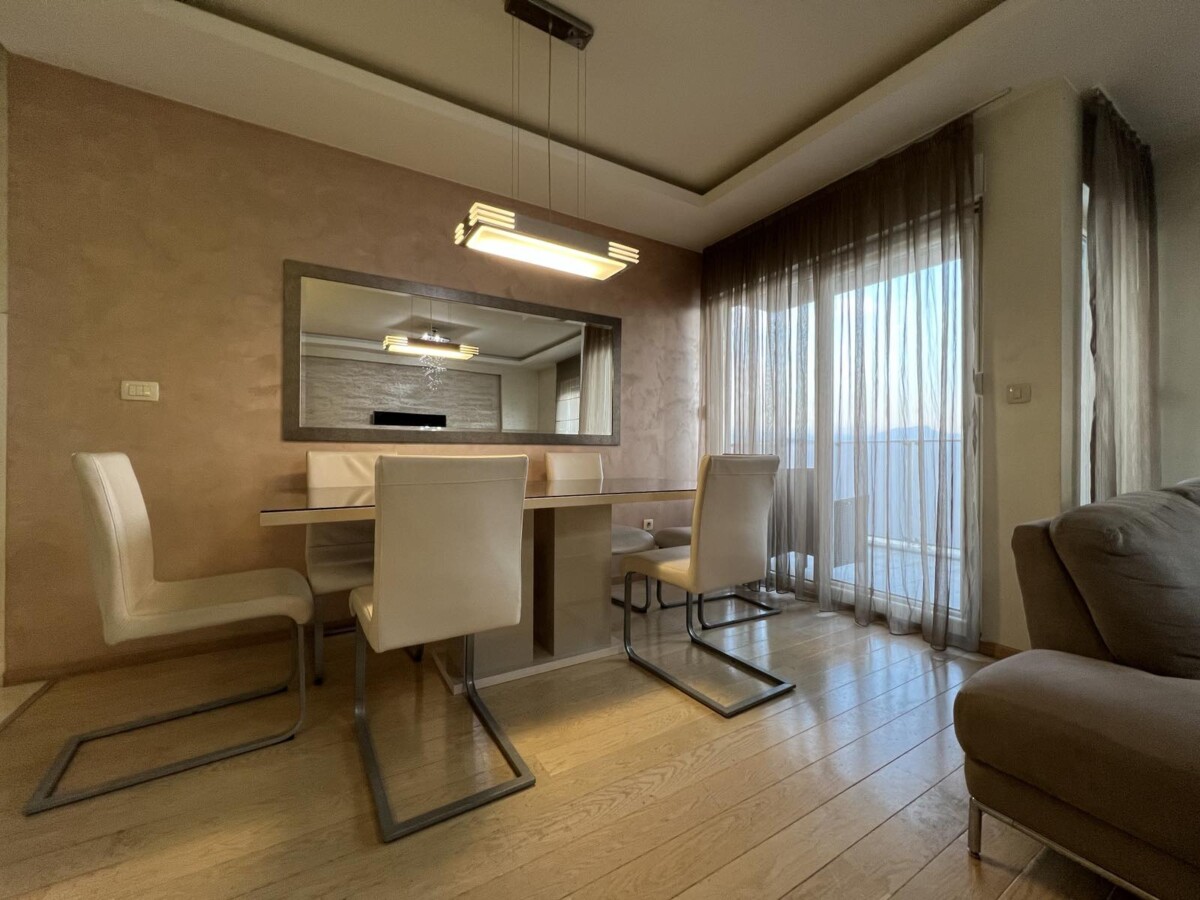 Izdaje se lijepo opremljen trosoban stan, povrsine 107m2, na sedmom (poslednji) spratu stambene zgrade, u City kvartu.