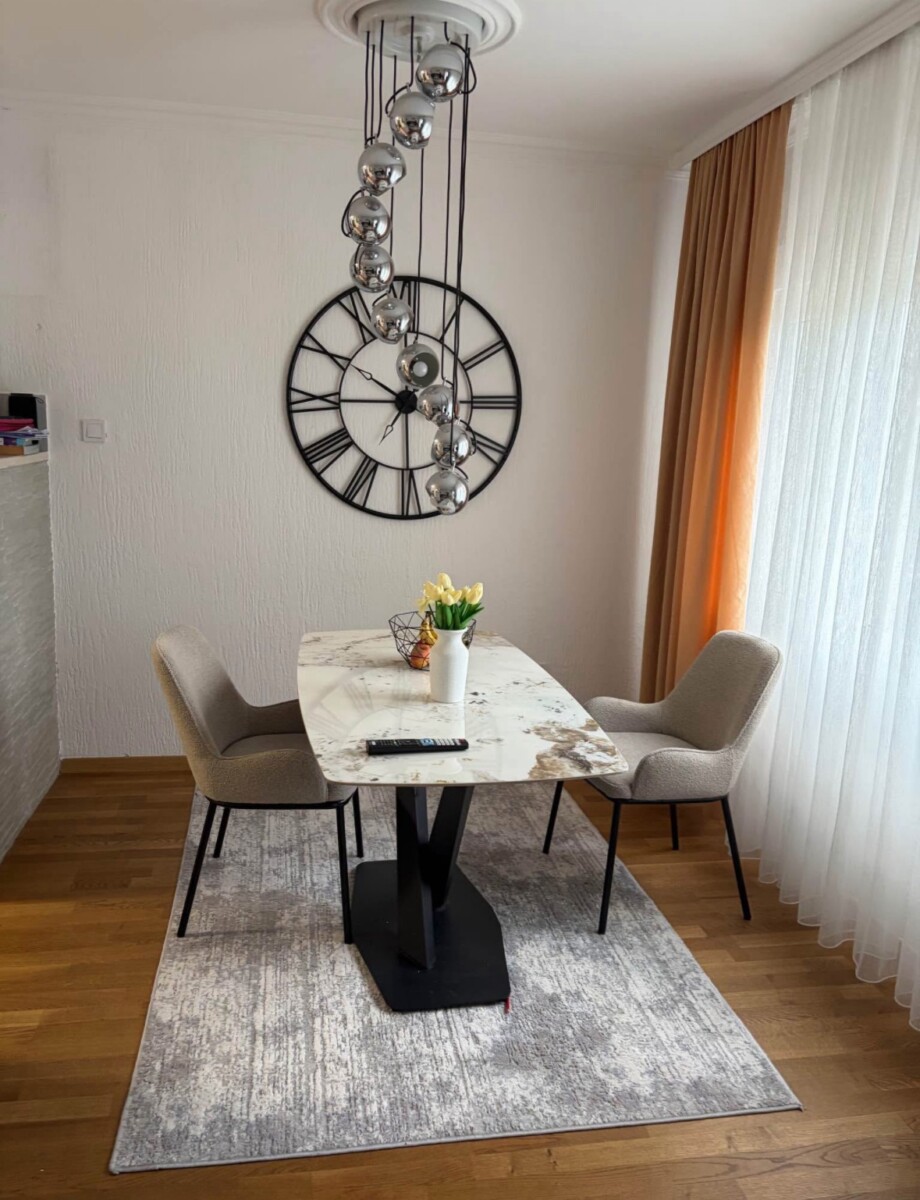 Struktura: dnevna soba, trpezarija, kuhinja i manja odvojena kuhinja, dvije spavaće sobe, kupatilo, terasa.